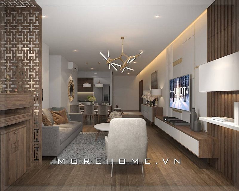 Lựa chọn sofa gỗ óc chó thiết kế theo phong cách hiện đại với vỏ bọc vải màu ghi tinh tế cho phòng khách căn hộ chung cư vừa sang trọng vừa tiện nghi gần gũi.