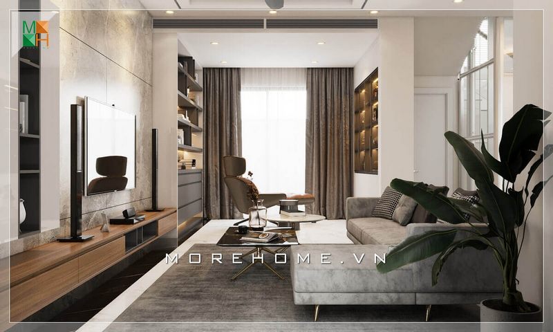 Phòng khách căn hộ chung cư vừa thoáng đãng, thoải mái lại ấm cúng tiện nghi với thiết kế sofa hiện đại kiểu dáng văng đôi đơn giản được bọc vải tone xám ấn tượng.