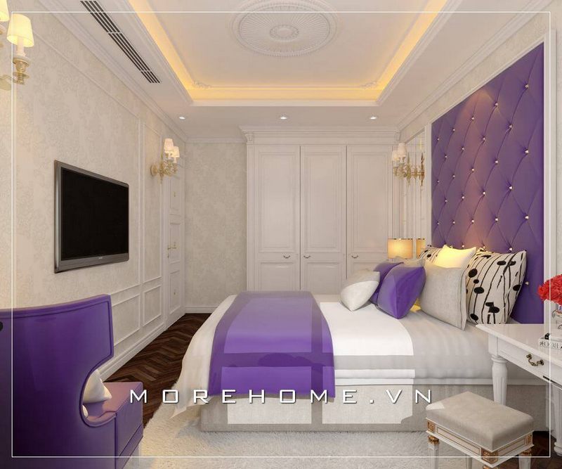 Thiết kế nội thất phòng ngủ chung cư sang trọng, các mảng tường được trang trí bằng giấy dán tường Hàn Quốc cao cấp giúp căn phòng không bị đơn điệu, tẻ nhạt