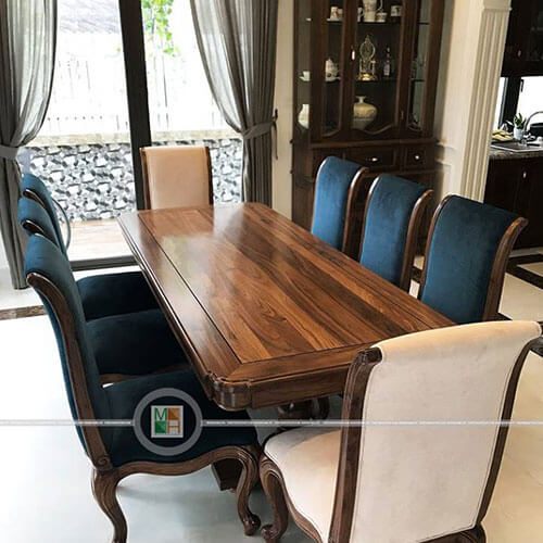 Bộ bàn ghế ăn 8 ghế gỗ óc chó có kiểu dáng đơn giản nhưng vẫn đảm bảo tinh tế.