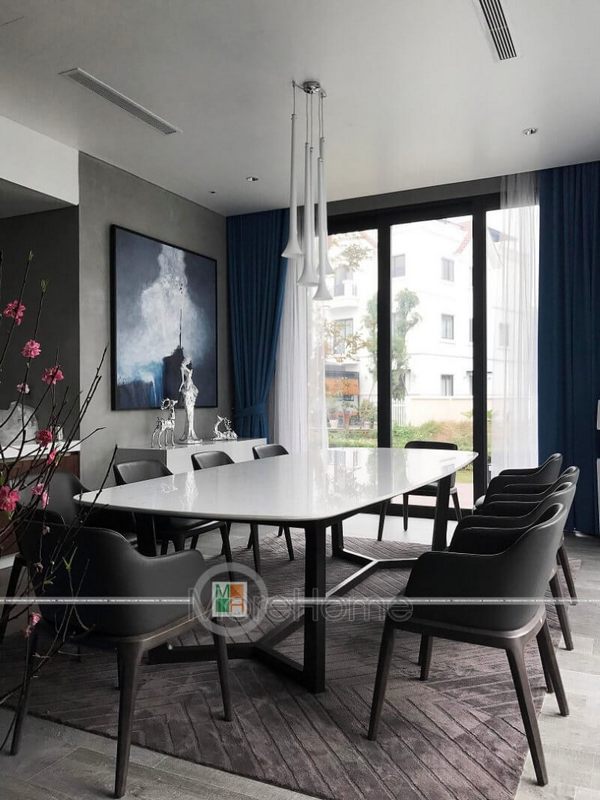 Hoàn thiện không gian phòng ăn biệt thự bằng cách thêm vào bộ bàn ghế ăn hiện đại.