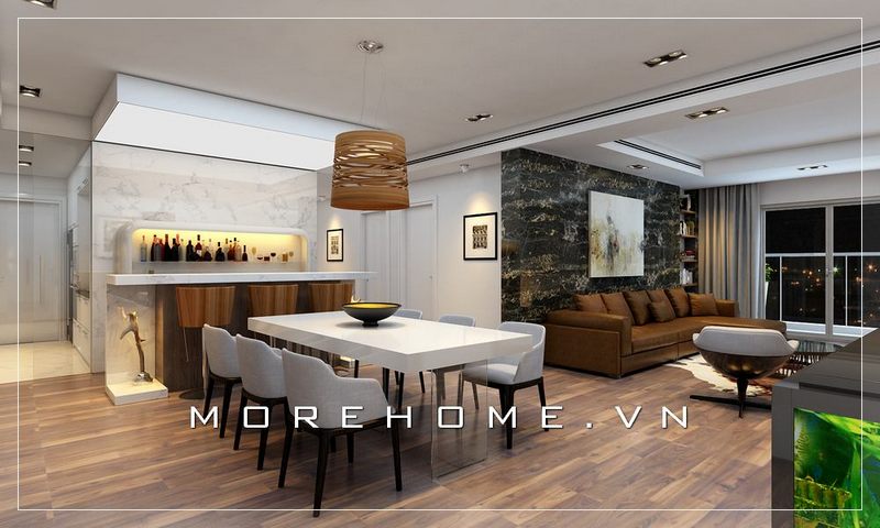 Trong bố trí nội thất phòng ăn biệt thự theo phong cách hiện đại, sự sử dụng của đèn không chỉ để chiếu sáng mà còn có tác dụng kích thích sự vui thú cho các thành viên trong gia đình. Kts Morehome đã sử dụng ý tưởng dùng đèn chiếu sáng dạng lục giác với 6 đỉnh tựa như đóa hoa đang bung nở, để tạo nên sự đẹp và thời điểm trong mỗi tổ ấm hiện đại. Bữa tối là bữa chính và quan trọng nhất trong 1 ngày làm việc bận rộn, và nghệ thuật ánh sáng sẽ giúp tác dụng của đèn được phát huy tối đa.
